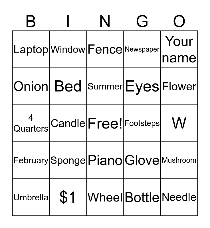 This bingo card has a free space and 39 words: Egg, Coin, Tongue, Glove, Needle, February, Candle, Clock, Footsteps, Mushroom, Onion, Window, A cold, W, 4 Quarters, Sponge, Piano, Newspaper, Bacon, Umbrella, Bed, Fence, Bottle, Your name, Mailman, $1, Summer, H, Giraffe, Laptop, October, Eraser, Eyes, Socks, Nails, Wheel, Trophy, Flower and Milk.