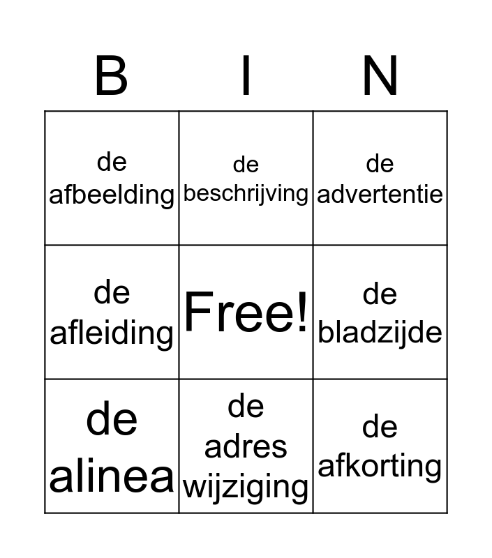 This bingo card has a free space and 10 words: de adres wijziging, de advertentie, de afbeelding, de afkorting, de afleiding, de alinea, de beschrijving, de bijsluiter, de bladzijde and het bonnetje.