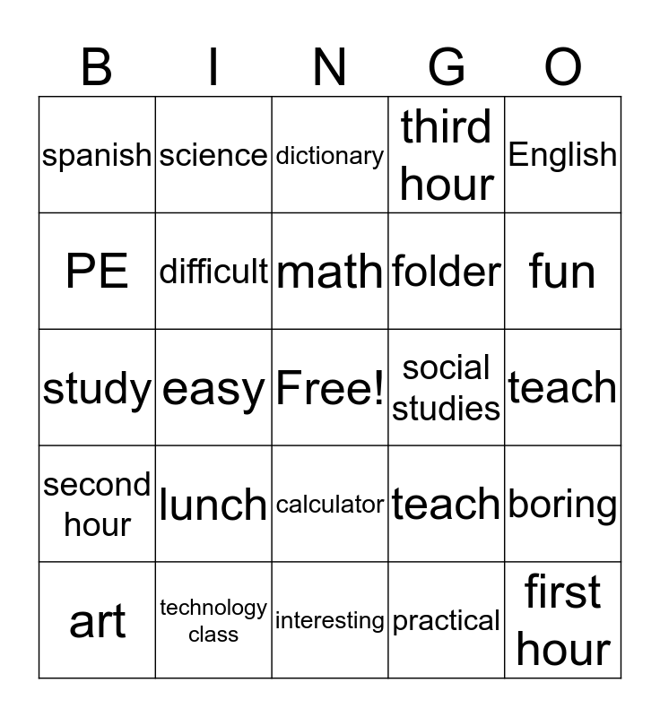 This bingo card has a free space and 24 words: lunch, technology class, math, art, English, spanish, PE, science, social studies, calculator, folder, study, teach, boring, difficult, practical, teach, dictionary, fun, easy, first hour, second hour, third hour and interesting.