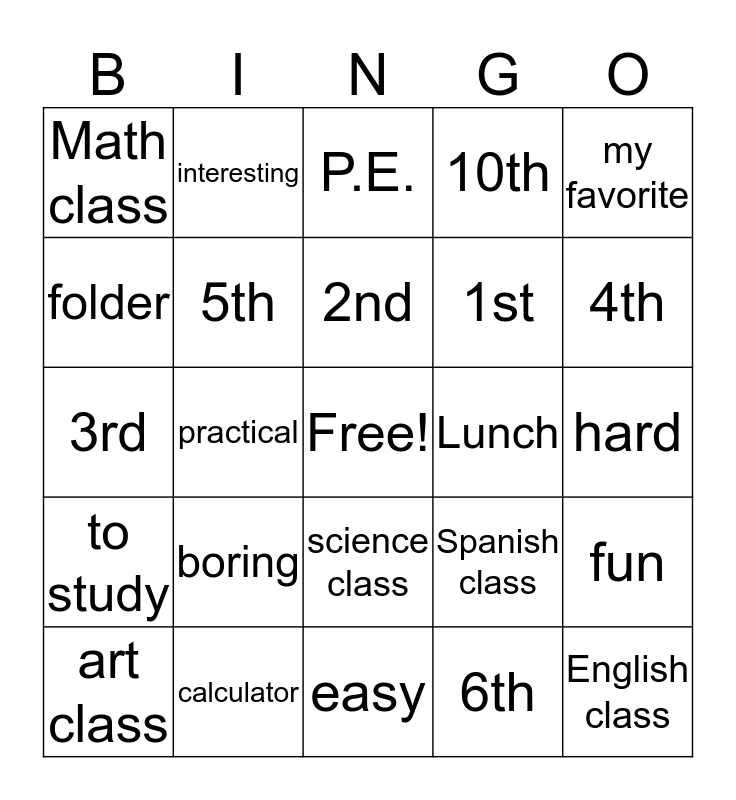 This bingo card has a free space and 24 words: boring, calculator, 2nd, art class, my favorite, Math class, folder, interesting, Lunch, science class, 1st, 3rd, Spanish class, fun, 5th, 6th, hard, P.E., 4th, practical, English class, to study, 10th and easy.