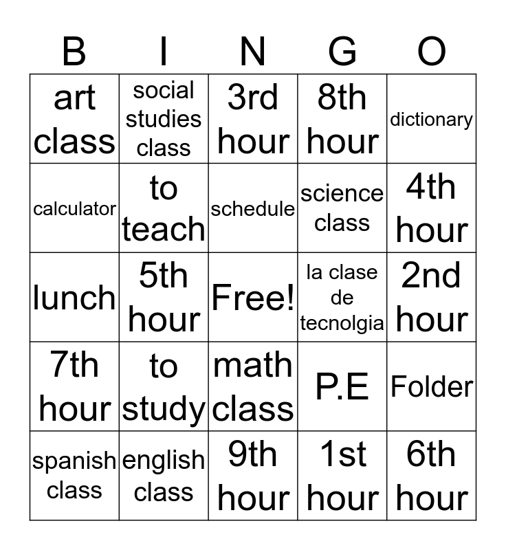 This bingo card has a free space and 24 words: to study, english class, schedule, spanish class, dictionary, art class, calculator, social studies class, la clase de tecnolgia, math class, science class, lunch, P.E, Folder, to teach, 1st hour, 2nd hour, 3rd hour, 4th hour, 5th hour, 6th hour, 7th hour, 8th hour and 9th hour.
