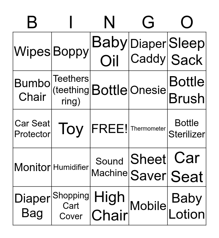 This bingo card has a free space and 42 words: Bib, Bottle, Blanket, Humidifier, Mobile, Car Seat, Baby Lotion, Baby Powder, Baby Oil, Sound Machine, Bottle Sterilizer, Bottle Brush, Toy, Sleep Sack, Changing Pad Cover, Sheet Saver, Water Proof Mattress Pad, Car Seat Protector, Baby Carrier Wrap, Boppy, Bumbo Chair, Diaper Pail, Diapers, Wipes, Wash Cloths, Pack N Play, Onesie, Mittens, Hat, Baby Gate, Towels, Monitor, Teethers (teething ring), High Chair, Booster Seat, Diaper Bag, Shopping Cart Cover, Thermometer, Pacifier, Crib Sheets, Diaper Caddy and Picture Frame.