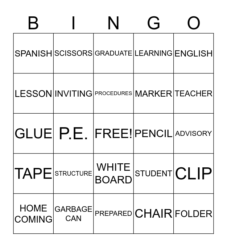 This bingo card has a free space and 24 words: STRUCTURE, GARBAGE CAN, PROCEDURES, HOME COMING, ENGLISH, SPANISH, LESSON, SCISSORS, PENCIL, WHITE BOARD, MARKER, GLUE, STUDENT, CLIP, INVITING, CHAIR, ADVISORY, GRADUATE, TEACHER, P.E., FOLDER, TAPE, LEARNING and PREPARED.