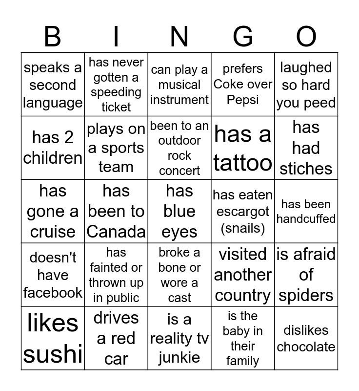 This bingo card has 25 words: has fainted or thrown up in public, is a reality tv junkie, been to an outdoor rock concert, likes sushi, laughed so hard you peed, speaks a second language, has 2 children, has never gotten a speeding ticket, has eaten escargot (snails), broke a bone or wore a cast, has a tattoo, has gone a cruise, visited another country, is afraid of spiders, plays on a sports team, dislikes chocolate, has been handcuffed, can play a musical instrument, has had stiches, has been to Canada, has blue eyes, drives a red car, doesn't have facebook, prefers Coke over Pepsi and is the baby in their family.