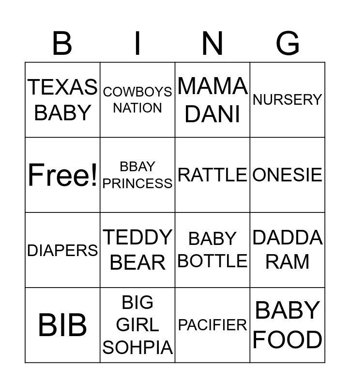 This bingo card has 16 words: BIG GIRL SOHPIA, DADDA RAM, MAMA DANI, TEXAS BABY, DIAPERS, COWBOYS NATION, BABY BOTTLE, PACIFIER, Free!, BBAY PRINCESS, BIB, NURSERY, TEDDY BEAR, ONESIE, RATTLE and BABY FOOD.