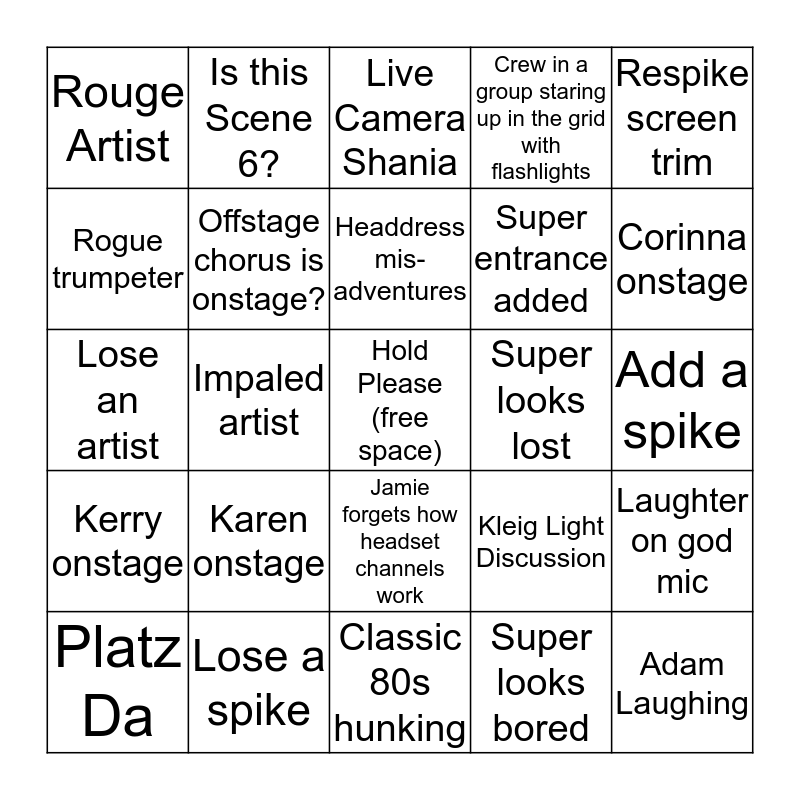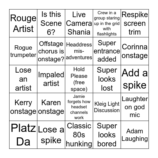 This bingo card has a free space and 31 words: Classic 80s hunking, Hold for panel move, Impaled artist, Rogue Elk, Rouge Artist, Live Camera Shania, Offstage chorus is onstage?, Kleig Light Discussion, Super looks lost, Super looks bored, Add a spike, Adam Laughing, Director onstage, Jenn onstage, Corinna onstage, Move a spike, Laughter on god mic, Karen onstage, Kerry onstage, Jamie forgets how headset channels work, Respike screen trim, Video content mixup, Platz Da, Is this Scene 6?, Super entrance added, Rogue trumpeter, Crew in a group staring up in the grid with flashlights, Lose an artist, Lose a spike, Headdress mis-adventures and JC’s headlamp onstage.