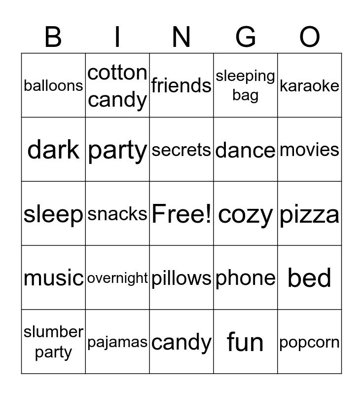 This bingo card has a free space and 24 words: overnight, pajamas, secrets, slumber party, karaoke, balloons, dark, cotton candy, cozy, pillows, dance, sleep, phone, bed, party, fun, pizza, friends, movies, snacks, popcorn, music, sleeping bag and candy.