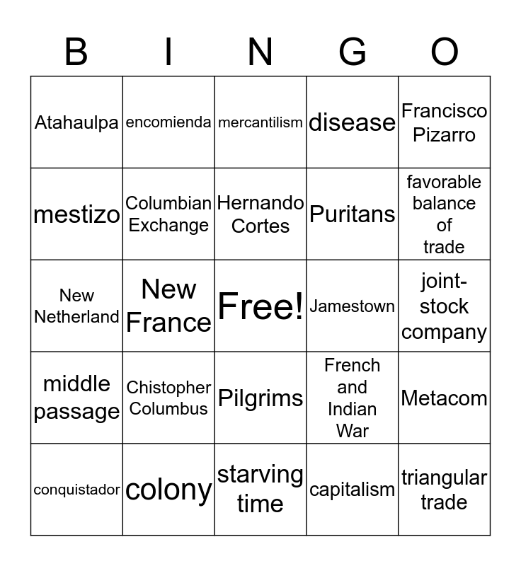 This bingo card has a free space and 24 words: Chistopher Columbus, colony, Hernando Cortes, conquistador, Francisco Pizarro, Atahaulpa, mestizo, encomienda, Jamestown, Pilgrims, Puritans, New Netherland, French and Indian War, Metacom, Columbian Exchange, capitalism, joint-stock company, mercantilism, favorable balance of trade, New France, triangular trade, middle passage, disease and starving time.