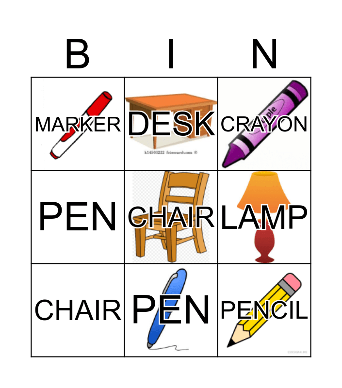 This bingo card has 9 images and 12 words: COUCH, PENCIL, CHAIR, LAMP, DESK, CRAYON, PEN, TABLE, MARKER, PEN, CHAIR and LAMP.