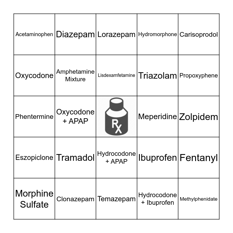 This bingo card has a free space and 24 words: Tramadol, Clonazepam, Lisdexamfetamine, Morphine Sulfate, Carisoprodol, Acetaminophen, Oxycodone, Diazepam, Meperidine, Hydrocodone + APAP, Triazolam, Phentermine, Ibuprofen, Fentanyl, Amphetamine Mixture, Hydrocodone + Ibuprofen, Zolpidem, Lorazepam, Propoxyphene, Oxycodone + APAP, Methylphenidate, Eszopiclone, Hydromorphone and Temazepam.