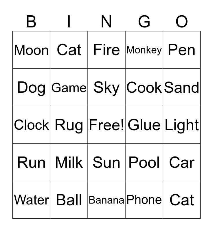 This bingo card has a free space and 24 words: Milk, Ball, Sky, Water, Pen, Moon, Dog, Cat, Glue, Sun, Cook, Clock, Pool, Car, Game, Phone, Light, Fire, Sand, Rug, Cat, Run, Monkey and Banana.