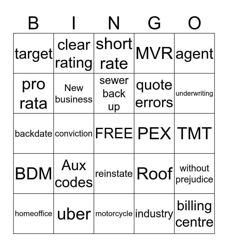 This bingo card has a free space and 89 words: PMS, Additional Insured, reinstate, bodily injury, commercial liability, Agency Bill, cancel, backdate, Travelers, wind/hail, sharepoint, guidewire, without prejudice, TMT, condo, sewer back up, policy service, customer service, claims, liability, accident benefits, loss, motorcycle, broker, backdate, uber, log home, fire, overland H2O, HITS, MVR, conviction, non disclosed, target, premium, short rate, pro rata, outlook, underwriting, homeoffice, BDM, software, HR, Risk Sharing Pool, Roof, PEX, Wiring, knob & tube, AUTO+, clear rating, comp, collision, SEF44, Vicarious Liability, earthquake, VIN, Watercraft, strata, TCPS, Solid heating, pellet stove, Appraisal, BCO, DURL, Late loss, Total Loss, Letter of Experience, Chieftan, Auto Reform, Aux codes, billing centre, broker portal, 3 pay, quote errors, New business, industry, insurance, wordings, exclusions, Uber, agent, adherence, tasks, phone, SLA, aluminium, repair, write off and 13D.