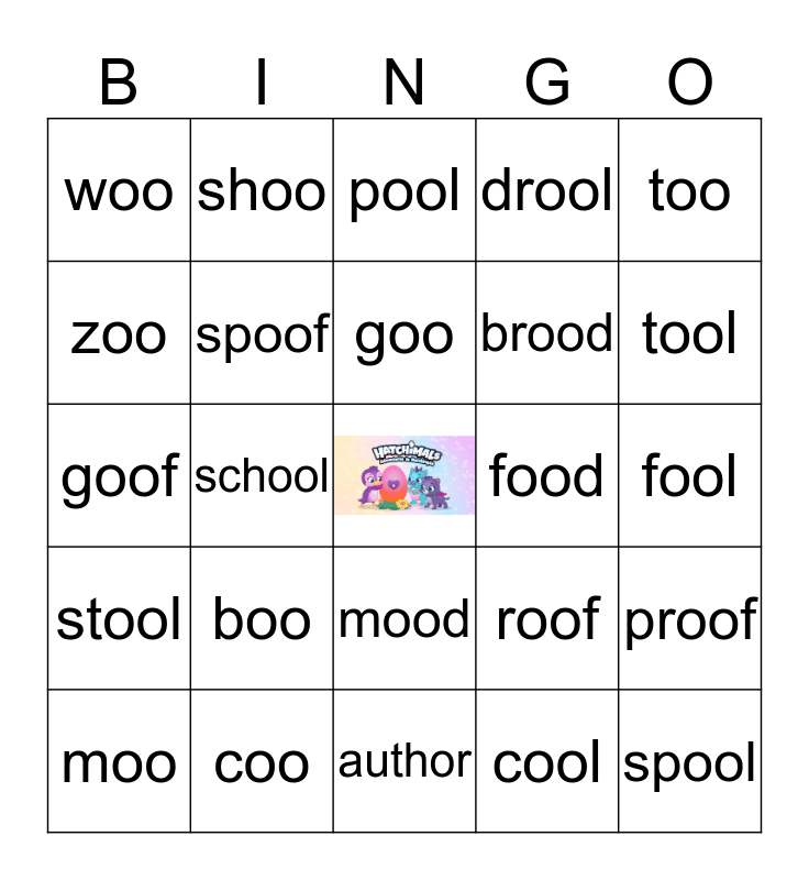 This bingo card has a free space and 24 words: boo, coo, goo, moo, too, woo, zoo, shoo, food, mood, brood, goof, roof, proof, spoof, cool, fool, pool, tool, school, spool, stool, drool and author.