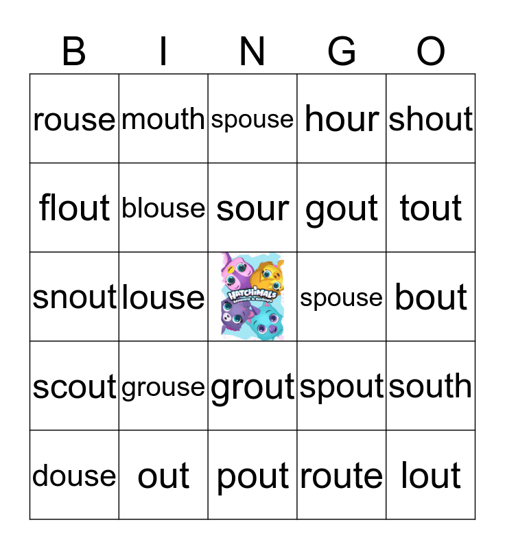 This bingo card has a free space and 29 words: douse, house, louse, mouse, rouse, spouse, blouse, grouse, spouse, out, bout, lout, pout, route, tout, clout, grout, scout, shout, snout, spout, sprout, gout, flout, hour, mouth, south, sour and flour.