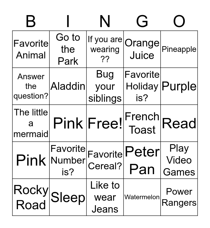 This bingo card has a free space and 29 words: Rocky Road, Hot cheetos, Pink, Camping, Favorite Animal, If you are wearing ??, Aladdin, Favorite Number is?, French Toast, Sleep, Read, Power Rangers, Like to wear Jeans, Watermelon, Purple, Wear socks, Favorite Cereal?, Pink, Pineapple, The little a mermaid, Peter Pan, Orange, Favorite Holiday is?, Answer the question?, Orange Juice, Go to the Park, Play Video Games, Bug your siblings and Sour Patch Kids.