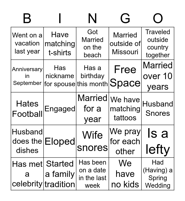 This bingo card has 30 words: Started a family tradition, We cook together, Engaged, We have a dog, Went on a vacation last year, Got Married on the beach, Has nickname for spouse, Wife snores, We have matching tattoos, Has been on a date in the last week, Husband Snores, Married for a year, We have no kids, Had (Having) a Spring Wedding, Married over 10 years, Wife mows the lawn, We pray for each other, Husband does the dishes, Eloped, Traveled outside country together, Hates Football, We have a cat, Have matching t-shirts, Free Space, Anniversary in September, Married outside of Missouri, Is a lefty, Has met a celebrity, Has a birthday this month and Loves Football.