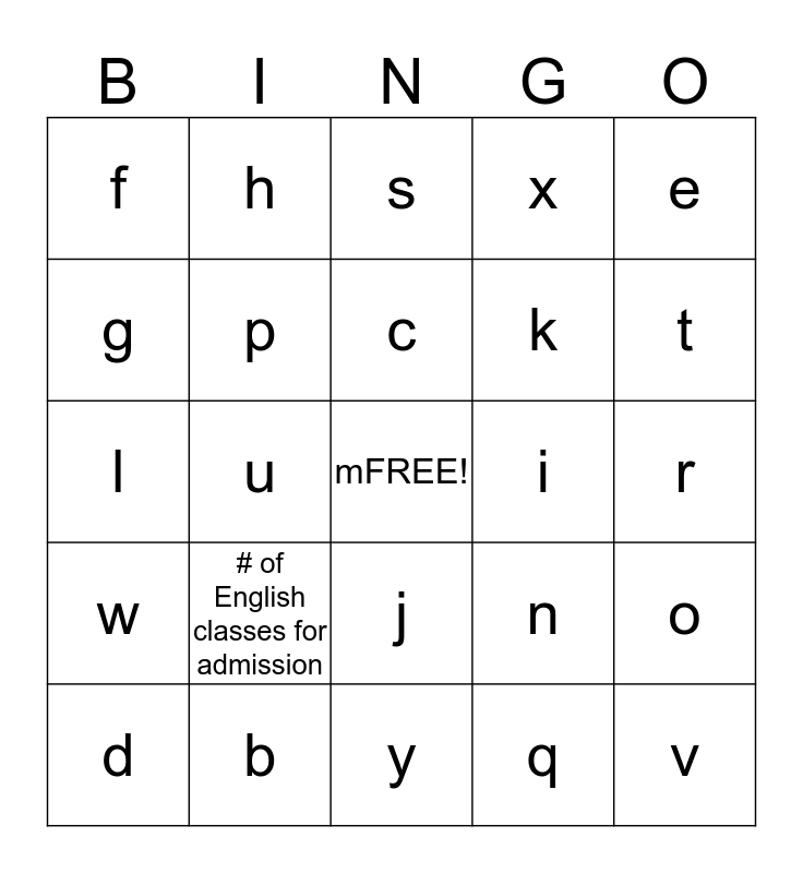 This bingo card has a free space and 24 words: # of English classes for admission, b, c, d, e, f, g, h, i, j, k, l, n, o, p, q, r, s, t, u, v, w, x and y.