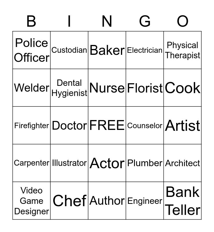 This bingo card has a free space and 35 words: Hair Stylist, Postal Worker, Veterinarian, Dental Hygienist, Actor, Electrician, Welder, Pharmacist, Nurse, Dentist, Firefighter, Physical Therapist, Teacher, Mechanic, Police Officer, Counselor, Engineer, Doctor, Carpenter, Bank Teller, Plumber, Video Game Designer, Architect, Chef, Baker, Cook, Principal, Truck Driver, Florist, Artist, Singer, Author, Illustrator, Custodian and Salesperson.