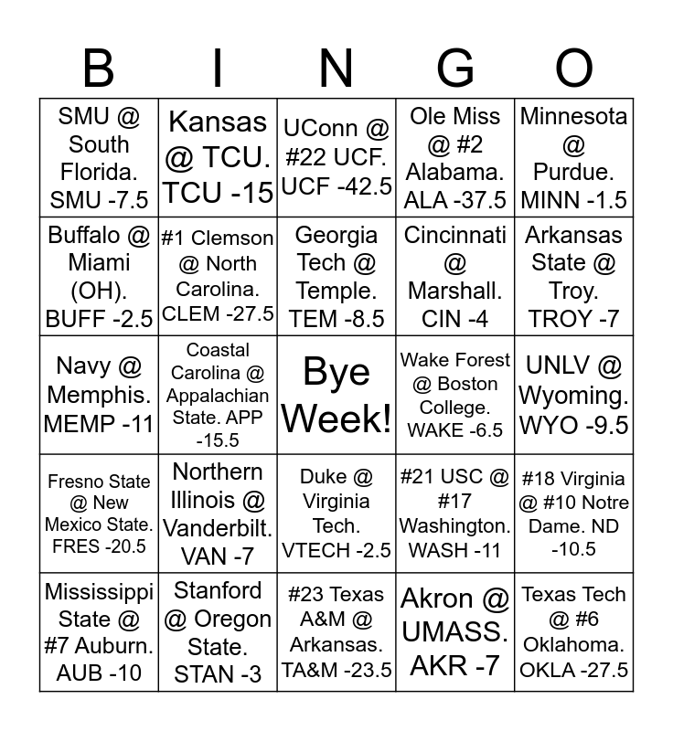 This bingo card has a free space and 51 words: Middle Tennessee @ #14 Iowa. IOWA -24, Texas Tech @ #6 Oklahoma. OKLA -27.5, Northwestern @ #8 Wisconsin. WIS -24.5, #23 Texas A&M @ Arkansas. TA&M -23.5, Northern Illinois @ Vanderbilt. VAN -7, Rutgers @ #20 Michigan. MICH -27.5, Kansas @ TCU. TCU -15, BYU @ Toledo. BYU -2.5, Buffalo @ Miami (OH). BUFF -2.5, Central Michigan @ Western Michigan. WMU -16.5, #1 Clemson @ North Carolina. CLEM -27.5, Ole Miss @ #2 Alabama. ALA -37.5, #18 Virginia @ #10 Notre Dame. ND -10.5, #21 USC @ #17 Washington. WASH -11, Indiana @ #25 Michigan State. MSU -14, Florida Atlantic @ Charlotte. CLT -1, Georgia Tech @ Temple. TEM -8.5, Wake Forest @ Boston College. WAKE -6.5, Iowa State @ Baylor. ISU -3, Minnesota @ Purdue. MINN -1.5, Coastal Carolina @ Appalachian State. APP -15.5, Akron @ UMASS. AKR -7, SMU @ South Florida. SMU -7.5, Cincinnati @ Marshall. CIN -4, New Mexico @ Liberty. LIB -7.5, East Carolina @ Old Dominion. ODU -3, Arkansas State @ Troy. TROY -7, Louisiana @ Georgia Southern. UL -3.5, Mississippi State @ #7 Auburn. AUB -10, UConn @ #22 UCF. UCF -42.5, #24 Kansas State @ Oklahoma State. OKST -5, South Alabama @ UL Monroe. ULM -14.5, UTEP @ Southern Mississippi. USM -26.5, UAB @ Western Kentucky. UAB -3, Louisiana Tech @ Rice. LAT -8.5, Stanford @ Oregon State. STAN -3, #5 Ohio State @ Nebraska. OSU -17, NC State @ Florida State. FSU -6.5, Kentucky @ South Carolina. SC -3, Colorado State @ Utah State. USU -23.5, UNLV @ Wyoming. WYO -9.5, Fresno State @ New Mexico State. FRES -20.5, Houston @ North Texas. UNT -7.5, Washington State @ #19 Utah. UTAH -6, UCLA @ Arizona. ARIZ -6.5, Hawai'i @ Nevada. NEV -2.5, Navy @ Memphis. MEMP -11, #12 Penn State @ Maryland. PENN -6.5, Arizona State @ #15 California. CAL -4, Duke @ Virginia Tech. VTECH -2.5 and San Jose State @ Air Force. AF -19.5.