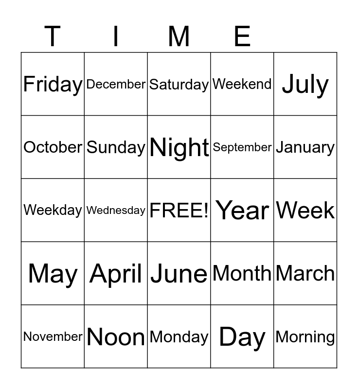 This bingo card has a free space and 31 words: Monday, Tuesday, Wednesday, Thursday, Friday, Saturday, Sunday, Month, Year, Day, Week, Morning, Noon, Night, January, February, March, April, May, June, July, August, November, December, September, October, Weekend, Weekday, Noon, Night and Afternoon.