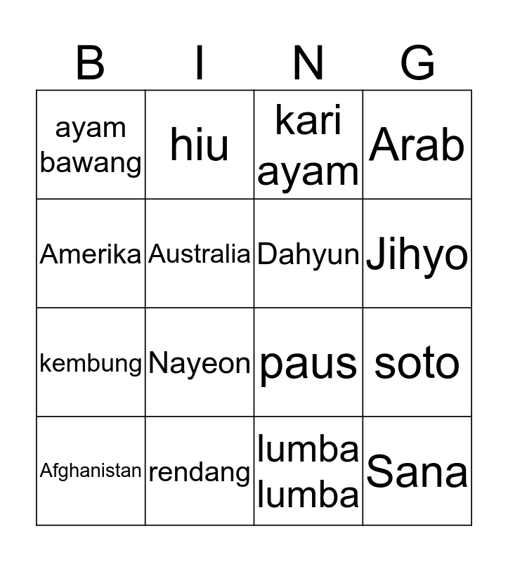 This bingo card has 16 words: rendang, soto, kari ayam, ayam bawang, kembung, hiu, paus, lumba lumba, Amerika, Australia, Afghanistan, Arab, Nayeon, Jihyo, Dahyun and Sana.