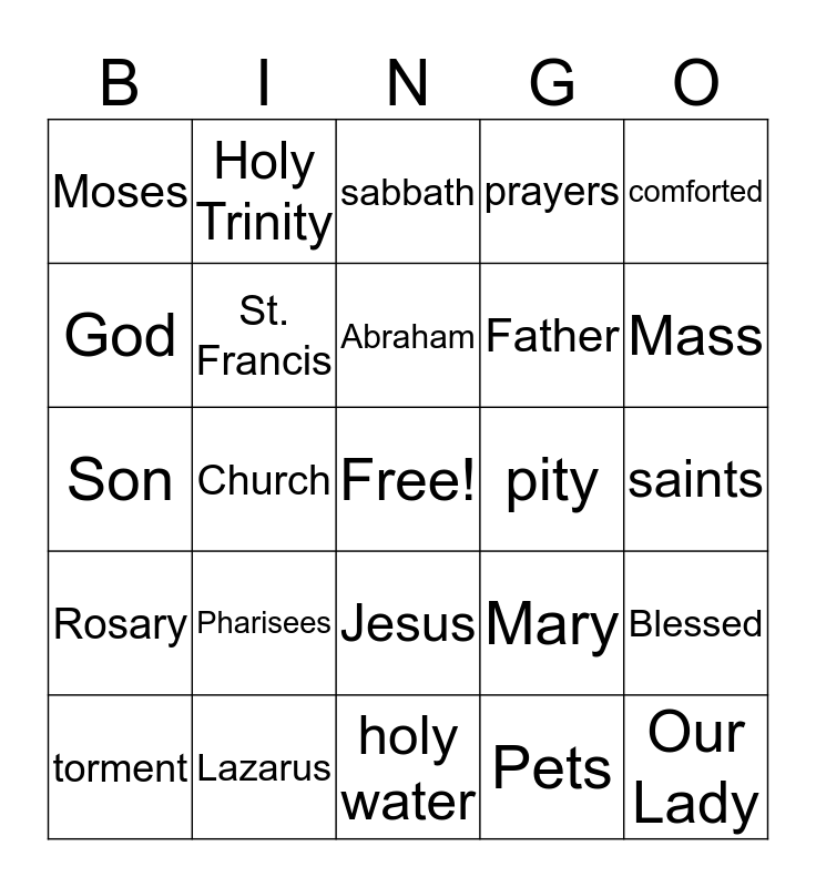 This bingo card has a free space and 24 words: Pharisees, Lazarus, Abraham, torment, comforted, Moses, God, Holy Trinity, pity, Jesus, Father, Son, Mary, Blessed, St. Francis, Pets, saints, sabbath, Mass, Church, Our Lady, Rosary, prayers and holy water.