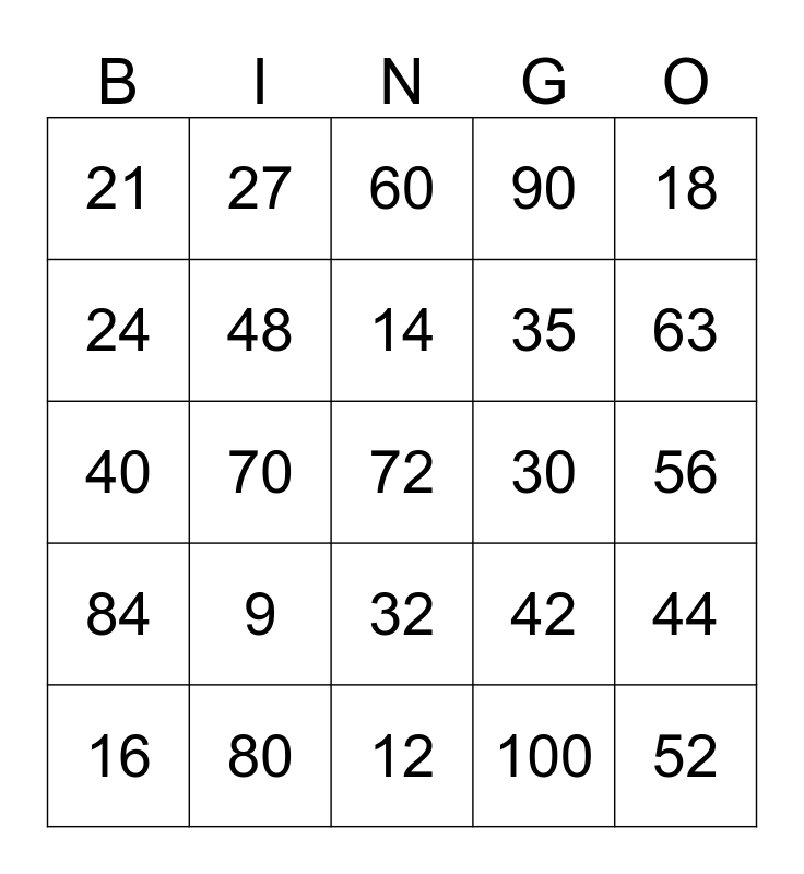 This bingo card has 25 words: 9, 12, 14, 16, 18, 21, 24, 27, 30, 32, 35, 40, 42, 44, 48, 52, 56, 60, 63, 70, 72, 80, 84, 90 and 100.
