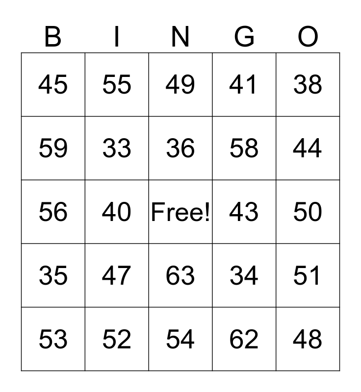 This bingo card has a free space and 36 words: 30, 31, 32, 33, 34, 35, 36, 37, 38, 39, 40, 41, 42, 43, 44, 45, 46, 47, 48, 49, 50, 51, 52, 53, 54, 55, 56, 57, 58, 59, 60, 61, 62, 63, 64 and 65.