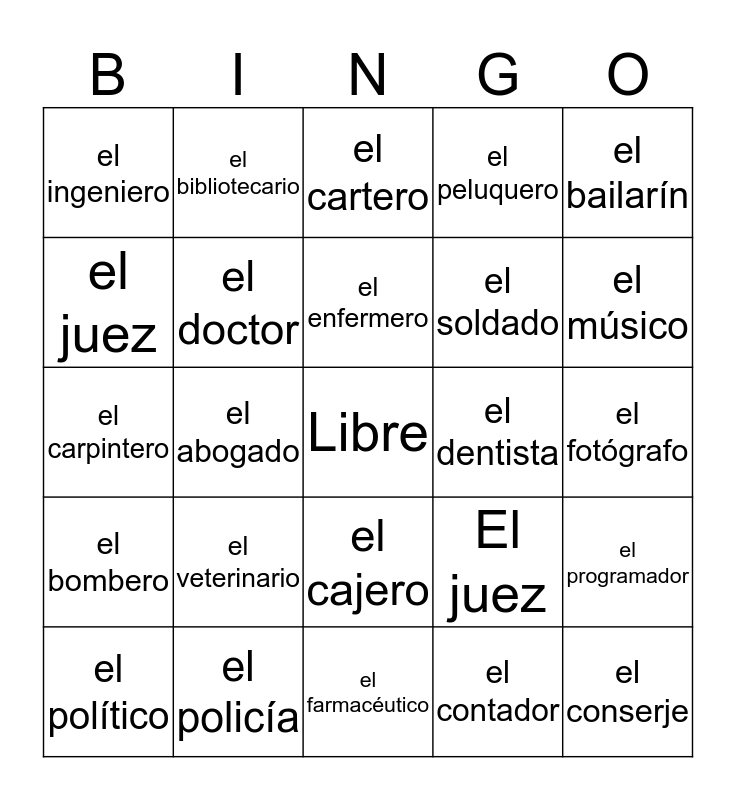 This bingo card has a free space and 27 words: El juez, el piloto, el soldado, el farmacéutico, el juez, el cartero, el bibliotecario, el bombero, el dentista, el programador, el carpintero, el peluquero, el político, el policía, el músico, el cantante, el doctor, el enfermero, el veterinario, el ingeniero, el fotógrafo, el contador, el abogado, el conserje, el cajero, el bailarín and el reportero.