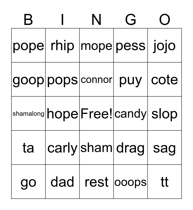 This bingo card has a free space and 24 words: carly, dad, connor, go, jojo, pope, goop, rhip, candy, sham, puy, shamalong, drag, sag, pops, ooops, slop, mope, cote, hope, tt, ta, pess and rest.