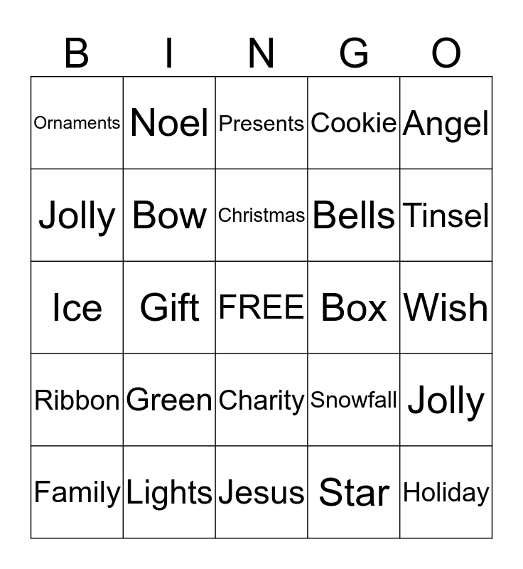 This bingo card has a free space and 24 words: Green, Lights, Christmas, Family, Angel, Ornaments, Jolly, Noel, Box, Charity, Bells, Ice, Snowfall, Jolly, Bow, Star, Wish, Presents, Tinsel, Gift, Holiday, Ribbon, Cookie and Jesus.