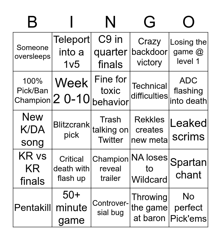 This bingo card has a free space and 24 words: Critical death with flash up, 50+ minute game, Fine for toxic behavior, Pentakill, Losing the game @ level 1, Someone oversleeps, 100% Pick/Ban Champion, Teleport into a 1v5, Rekkles creates new meta, Champion reveal trailer, Technical difficulties, New K/DA song, NA loses to Wildcard, Spartan chant, Week 2 0-10, Throwing the game at baron, Leaked scrims, C9 in quarter finals, ADC flashing into death, Blitzcrank pick, No perfect Pick'ems, KR vs KR finals, Crazy backdoor victory and Controver- sial bug.