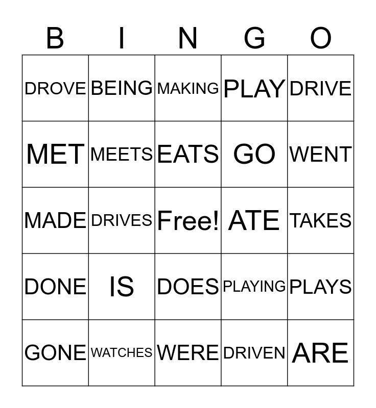 This bingo card has a free space and 49 words: AM, ARE, WAS, WERE, IS, BEEN, BEING, MEET, MET, MEETING, MEETS, PLAY, PLAYS, PLAYING, PLAYED, EAT, EATS, ATE, EATEN, DRIVE, DRIVES, DRIVEN, DROVE, GO, GOES, WENT, GONE, DO, DOES, DONE, DID, DOING, DRIVING, WATCH, WATCHES, WATCHED, WATCHING, TAKE, TAKES, TOOK, TAKING, TAKEN, MAKE, MAKES, MADE, MAKING, BUY, BOUGHT and BUYS.