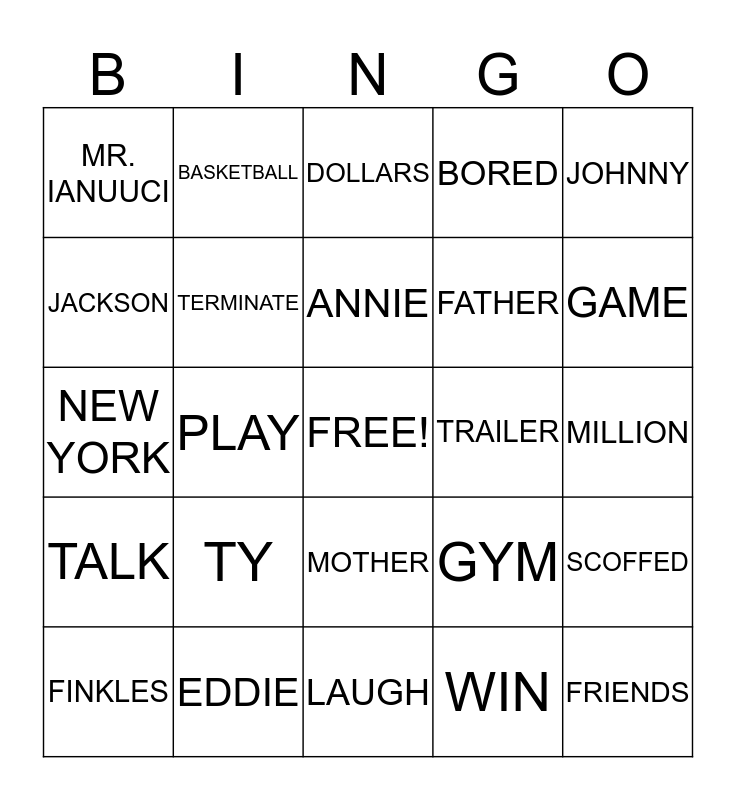 This bingo card has a free space and 24 words: TY, EDDIE, ANNIE, FINKLES, JOHNNY, MR. IANUUCI, JACKSON, BASKETBALL, TRAILER, MOTHER, FATHER, NEW YORK, GYM, SCOFFED, TERMINATE, WIN, MILLION, DOLLARS, GAME, PLAY, FRIENDS, TALK, BORED and LAUGH.