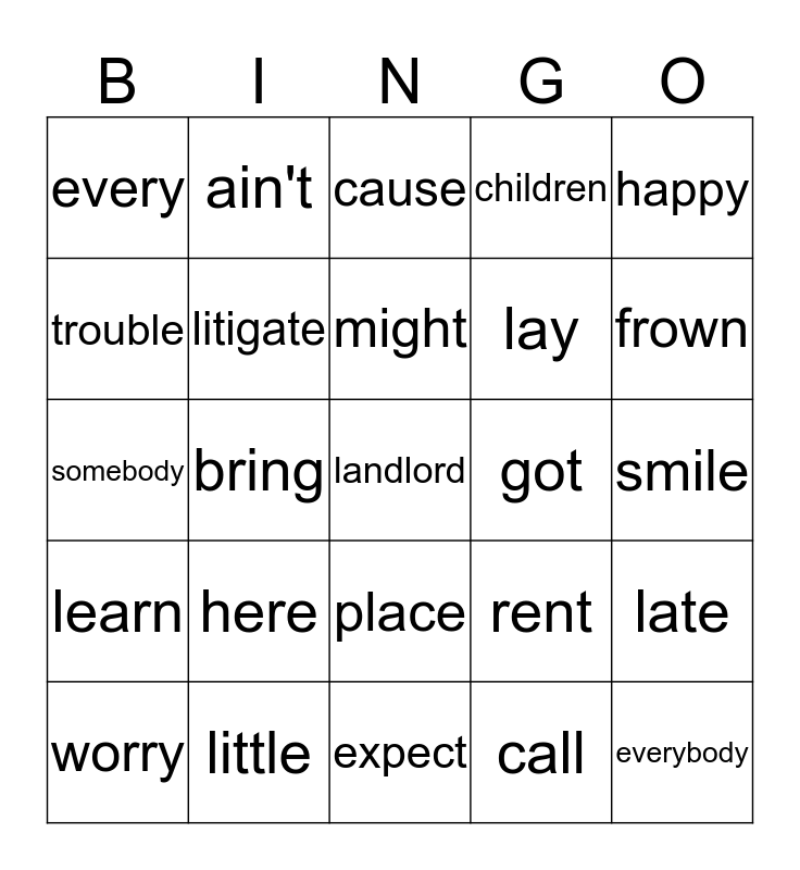 This bingo card has a free space and 24 words: here, little, might, worry, happy, every, trouble, ain't, got, place, lay, somebody, rent, late, litigate, call, smile, cause, frown, bring, everybody, learn, children and expect.