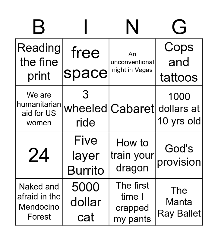 This bingo card has 16 words: Naked and afraid in the Mendocino Forest, 5000 dollar cat, An unconventional night in Vegas, Cops and tattoos, We are humanitarian aid for US women, free space, How to train your dragon, God's provision, Reading the fine print, 3 wheeled ride, The first time I crapped my pants, 1000 dollars at 10 yrs old, 24, Five layer Burrito, Cabaret and The Manta Ray Ballet.