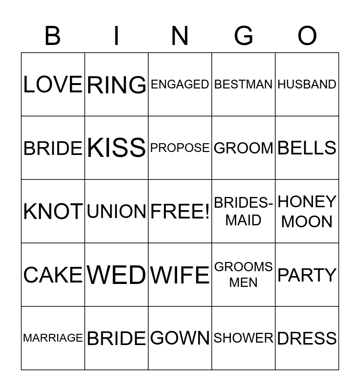This bingo card has a free space and 24 words: WED, BRIDE, PROPOSE, MARRIAGE, HUSBAND, LOVE, BRIDE, RING, BRIDES- MAID, WIFE, GROOM, KNOT, GROOMS MEN, PARTY, KISS, SHOWER, HONEY MOON, ENGAGED, BELLS, UNION, DRESS, CAKE, BESTMAN and GOWN.