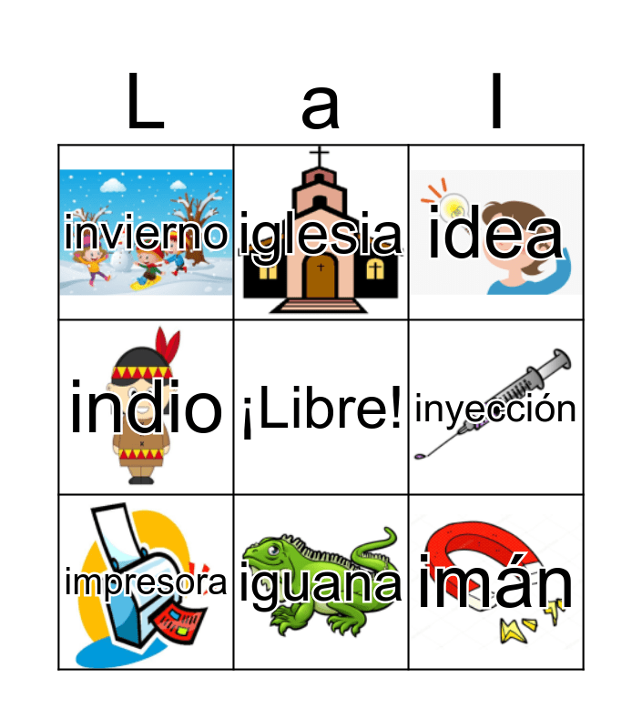 This bingo card has 13 images, a free space and 13 words: iglú, insecto, impresora, iglesia, indio, imán, izquierda, isla, iguana, invierno, inyección, idea and inflar.