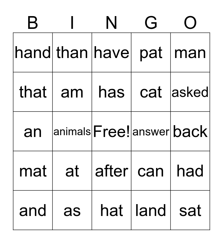 This bingo card has a free space and 24 words: at, as, has, and, man, hand, that, than, answer, after, cat, an, can, had, am, land, back, have, asked, animals, sat, mat, pat and hat.