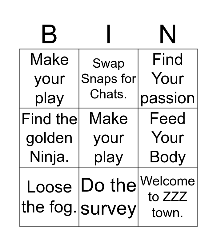 This bingo card has a free space and 8 words: Feed Your Body, Find Your passion, Swap Snaps for Chats., Loose the fog., Make your play, Welcome to ZZZ town., Find the golden Ninja. and Do the survey.