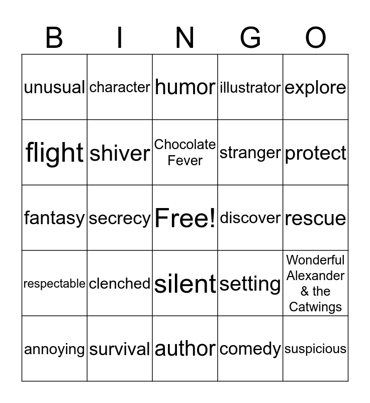 This bingo card has a free space and 29 words: annoying, bruise, secrecy, ridiculous, unusual, humor, shiver, clenched, discover, survival, rescue, suspicious, author, comedy, protect, frail, silent, respectable, explore, fantasy, setting, suspense, stranger, flight, illustrator, character, Wonderful Alexander & the Catwings, Chocolate Fever and Lost Treasure of Emerald Eye.