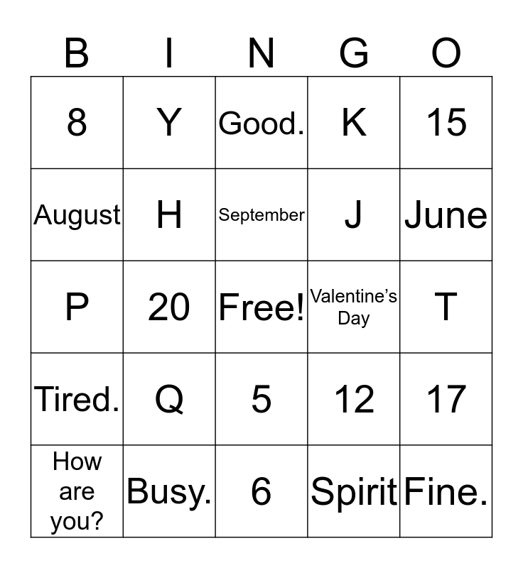 This bingo card has a free space and 96 words: Christmas, Easter, Thanksgiving, Valentine’s Day, Birthday, New Year’s, St. Patrick’s Day, Halloween, January, February, March, April, May, June, July, August, September, October, November, December, 1, 2, 3, 4, 5, 6, 7, 8, 9, 10, 11, 12, 13, 14, 15, 16, 17, 18, 19, 20, Hello., How are you?, Fine., Busy., Tired., Good., Happy., What’s up?, Nothing., Same old, same old., Sick., Sleepy., So-so., Are you Deaf?, Do you sign?, I know a little., Understand, Again, Cash, Boy, Girl, Mom, Dad, Brother, Sister, Thank you, Please, Jesus, God, Spirit, A, B, C, D, E, F, G, H, I, J, K, L, M, N, O, P, Q, R, S, T, U, V, W, X, Y and Z.
