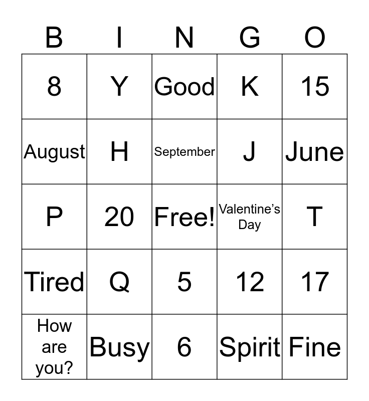 This bingo card has a free space and 96 words: Christmas, Easter, Thanksgiving, Valentine’s Day, Birthday, New Year’s, St. Patrick’s Day, Halloween, January, February, March, April, May, June, July, August, September, October, November, December, 1, 2, 3, 4, 5, 6, 7, 8, 9, 10, 11, 12, 13, 14, 15, 16, 17, 18, 19, 20, Hello, How are you?, Fine, Busy, Tired, Good, Happy, What’s up?, Nothing, Same old, same old., Sick, Sleepy, So-so, Are you Deaf?, Do you sign?, I know a little., Understand, Again, Cash, Boy, Girl, Mom, Dad, Brother, Sister, Thank you, Please, Jesus, God, Spirit, A, B, C, D, E, F, G, H, I, J, K, L, M, N, O, P, Q, R, S, T, U, V, W, X, Y and Z.