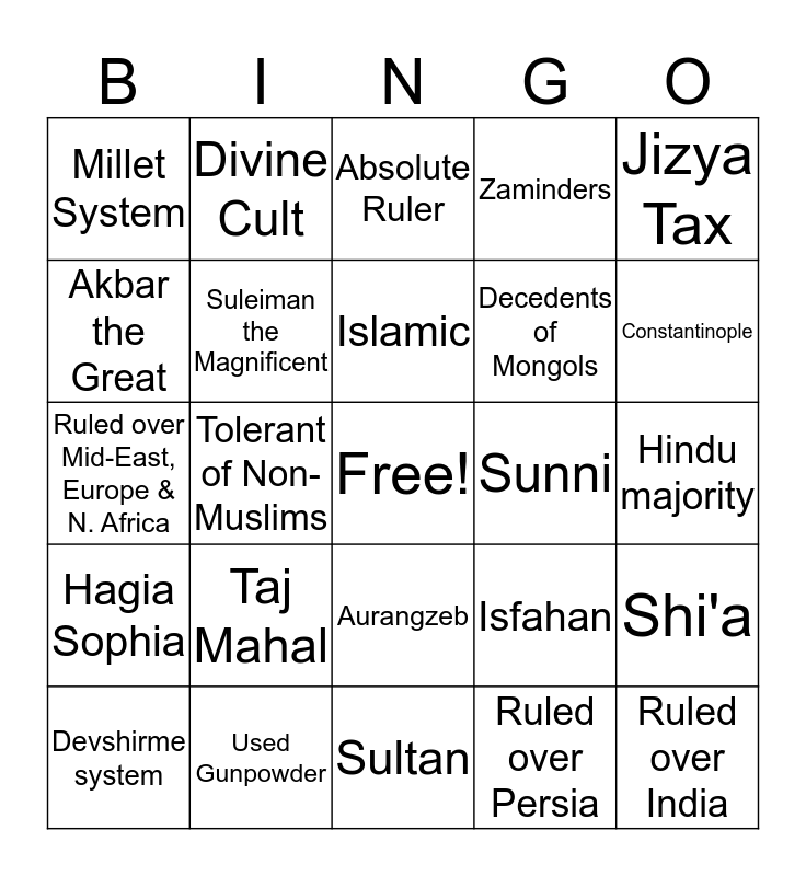 This bingo card has a free space and 29 words: Terror of the Turks, Used Gunpowder, Absolute Ruler, Built Monumental Architecture, Jizya Tax, Millet System, Suleiman the Magnificent, Islamic, Sunni, Shi'a, Devshirme system, Tolerant of Non-Muslims, Ruled over Persia, Ruled over India, Ruled over Mid-East, Europe & N. Africa, Shah, Sultan, Isfahan, Constantinople, Hagia Sophia, Taj Mahal, Sikhism, Decedents of Mongols, Hindu majority, Akbar the Great, Divine Cult, Aurangzeb, Zaminders and Bureaucracy.