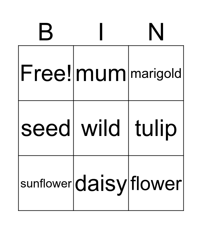 This bingo card has 9 words: sunflower, marigold, mum, seed, Free!, tulip, wild, flower and daisy.