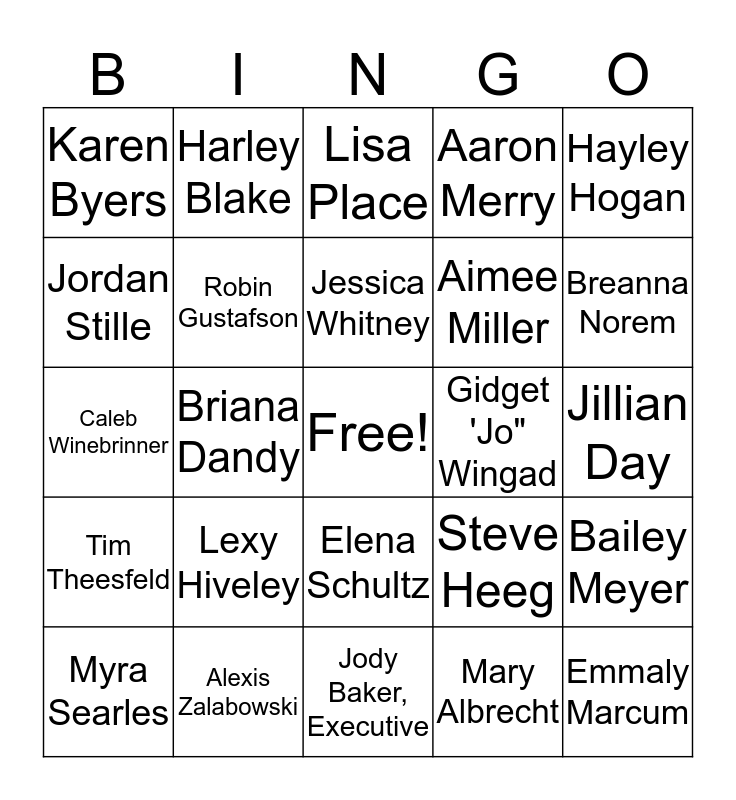 This bingo card has a free space and 145 words: Lori Cable, Beth Heide, Erin Akin, Tim Kinnetz, Chris Friedrichs, Steve Heeg, Jenna Peterson, Jenna Peterson, Joe Leaser, Phil Kassel, Jodi Bunde, Kelsie Brandt, Christine Vermeys, Jackie Grave, Tara Anderson, Brittney Steinkamp, Colan Borchers, Maggie Dykstra, Teanna Wolff, Kristen Mueggenberg, Bailey Meyer, Bailey Meyer, Kim Slipke, Shelby Meyer, Sadie Breitbach, Briana Dandy, Harley Blake, Anastasia Marchard, Hanna Russmann, Jamie Began, Ashley Linquist, Casidy Cavanaugh, Erika Schutte, Jillian Day, Megan Dyhrkopp, Nikki Menken, Shelly Doyle, Valerie Yeager, Aimee Miller, Mitch Day, Beca Will, Jordan Poock, Elena Schultz, Emily Steichen, Aimee Fowler, Ada DeGraaf, Christofer Luinstra, Alan Hoppe, Brock Holman, Crystal Doppler, Danielle Einck, Megan O'Brien, Myra Searles, Travis Chinn, Zoey Russell, Amanda Becker, Dustin Svoboda, Jackie Brevik, Jade Norem, Jennie Rieck, Lisa Place, Mallory Pooch, Michelle Lundgren, Erin Stevens, Alex Robinson, Gidget 'Jo" Wingad, Tim Theesfeld, Isabella Moore, Kerri Robinson, Zach Myer, Cody Harris, Dustin Beisch, Karen Byers, Cheryl Lundgren, Brianne Barghusen, Mary Semerjyan, Jordan Thomas, Becca Spooner, Nicole Mergen, Aaron Merry, Kelsey Leland, Cary Morehouse, Monica Koechle, Tammi Schnetter, Jan Bowles, Rhonda Brinck, Sally Anderson, Shelby Lovstad, Max Rohlfsen, Jody Baker, Executive, Tessa Buehler, Heather Wells, Callie Herke, Logan Lynn, Alexis Zalabowski, Angela Clement, Anjelica Gallardo, Brittaney Thomsen, Caleb Winebrinner, Danielle Fuentez, Jodi Kelly, Jordan Stille, Kendra Rassler, Emily Coleman, Iniki Bremser, Jessica Whitney, Kelly Keeler, Kelsey Huff, Savanna Johnson, Sydney Toebes, Allicia Haar, Lexy Hiveley, Michelle Johnson, Breanna Norem, Brooke Hoffman, Emmaly Marcum, Hayley Hogan, Jessica Petersen, Jonathan Wubben, Madison More, Molly Grisham, Stephanie Craig, Jared Ransom, Kelsey Ackerman, Mary Albrecht, Nicole Dean, Paige Sorenson, Steph Piddington, Alyssa Bainbridge, Amanda Cook, Amanda Fiedler, Amie Hughes, Brittany Lowe, Candace Anderson, Danielle Gathercole, Kaycee Christensen, Mark Sienknecht, Michael Searles, Monica Hendrickson, Noel Vickery, Robin Gustafson, Tracy Spada, Morgan Garland, Bailey Ford and Myah Guerrero.