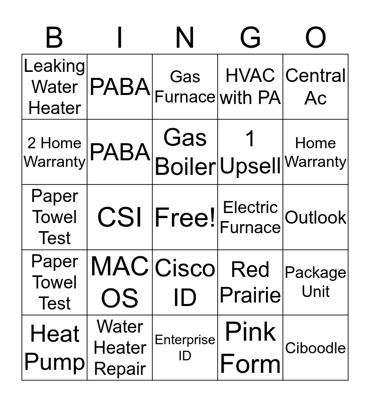 This bingo card has a free space and 61 words: HVAC repair, Water Heater Repair, TX Water Heater, Paper Towel Test, Pink Form, PM check, PABA, 1 Home Warranty, 1 Upsell, Water Heater with IW, HVAC with PA, HVAC replacement, 2 Home Warranty, 2 Upsells, Water Heater with PA, Leaking Water Heater, Ciboodle, Central Ac, Oil Boiler, Gas Boiler, Electric Furnace, Gas Furnace, Heat Pump, Package Unit, Mini Split, Carrier, Kenmore, Protection Agreement, Home Warranty, IW HVAC Repair, Upsell, Ciboodle, Pink Form, PM Check, PABA, Water Heater, Leaking Water Heater, CSI, Schedule Adherence, Paper Towel Test, Member Resolution Specialist, MAC OS, Outlook, Offline Tracker, Red Prairie, MAC Home Page, Home Warranty, Segno, Calabrio, Cisco ID, Enterprise ID, Sales ID, Take The Lead, In Store Promoters, Plus Appointment, Prime Appointment, Virtual Sales Specialist, Countertops, Flooring, Kitchen Remodeling and Doors.
