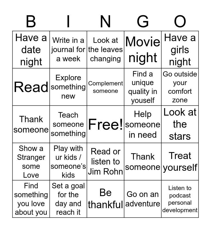 This bingo card has a free space and 24 words: Play with ur kids / someone’s kids, Set a goal for the day and reach it, Complement someone, Find something you love about you, Have a girls night, Have a date night, Read, Write in a journal for a week, Help someone in need, Read or listen to Jim Rohn, Find a unique quality in youself, Thank someone, Thank someone, Treat yourself, Explore something new, Go on an adventure, Look at the stars, Look at the leaves changing, Go outside your comfort zone, Teach someone something, Listen to podcast personal development, Show a Stranger some Love, Movie night and Be thankful.