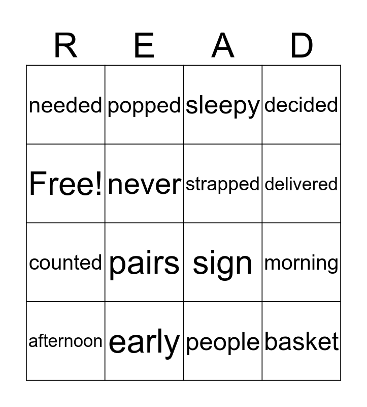 This bingo card has 16 words: early, morning, sleepy, needed, counted, popped, sign, people, Free!, never, afternoon, decided, pairs, delivered, strapped and basket.