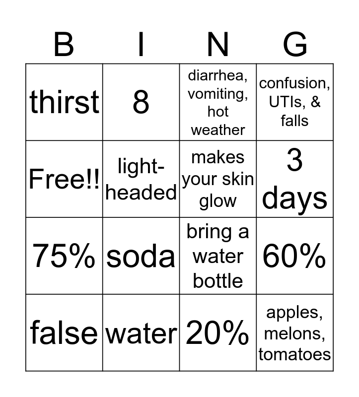 This bingo card has 16 words: water, 60%, diarrhea, vomiting, hot weather, thirst, 75%, 8, bring a water bottle, 20%, Free!!, light-headed, false, confusion, UTIs, & falls, soda, 3 days, makes your skin glow and apples, melons, tomatoes.